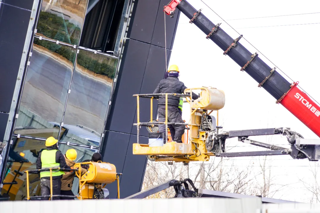 走在施工现场,记者了解到晶龙国际会展中心是对原车间厂房进行高起点改建,既盘活了闲置资源,又减少了重复建设带来的浪费。项目推进初期,面对图纸缺失、管线复杂、设备拆改难等多重挑战,项目团队创新采用“集团招标、公司统筹”的协作模式,主动加班加点抢进度、保安全,将原需半年以上的顶层拆除工程压缩至80天;仅用一周就高效完成中央道路电池板拆改。如今,随着各项工程按节点稳步推进,场馆雏形愈发清晰,主入口及主立面改造、亮化工程加速落地,主场馆建设紧锣密鼓,钢结构龙骨完工,玻璃安装95%、铝板安装75%;大门大字及大屏施工预计本周完成;内部基础设施正提速配套同步完善,确保场馆实用安全,契合会展客户需求。