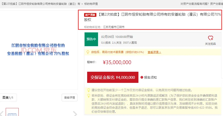 详情: 江阴市人民法院于2025年6月19日受理其破产清算,并于10月正式宣告破产。该公司财务状况触目惊心,资产仅5017.63元,负债却高达近4932万元,严重资不抵债。目前,管理人计划于2026年2月公开拍卖其持有的子公司安基轮胎(灌云)有限公司70%股权。值得注意的是,该标的起拍价定为3500万元,较首次拍卖7000万元的底价已“腰斩”。