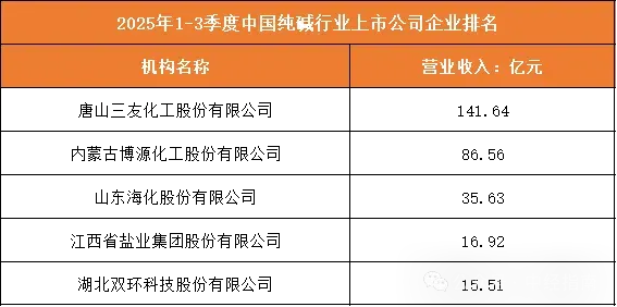 根据申万行业分类,2025年1-3季度中国纯碱行业上市公司按营业收入排名如下:(A股上市公司)