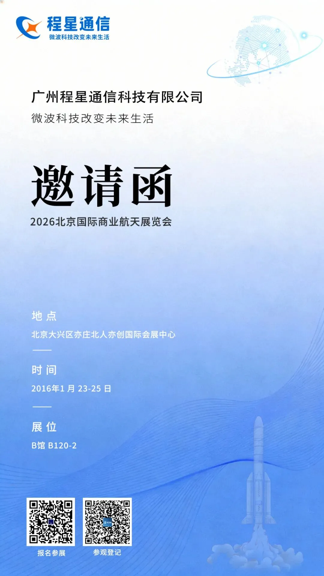 瞄准世界尖端,创新民族产业。 程星通信期待在B120-2号展位,与您共话微波科技的无限可能,以坚实可靠的射频基座,共筑商业航天新时代。扫码填写信息,可在现场领取一份精美小礼品。