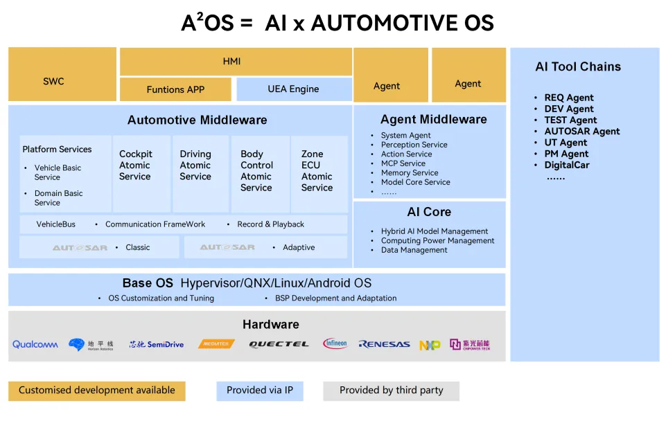 随着汽车产业迈入AIDV时代,AI正在深度融入操作系统。光庭信息推出的A²OS是面向中央计算架构的下一代整车操作系统,支持人机协同开发,赋能域控软件快速研发。A²OS融合了AI大模型与整车OS能力,在软硬解耦的架构下,构建出AP/CP一体化平台,支持插件化部署和服务化通信,适配多种域控形态。A²OS不仅下沉了智能化能力,提供Agent中间件与多模态支持,还配套了人机协同的开发工具链和仿真验证环境,加速软件的开发与测试,提升交付效率。目前A²OS已覆盖从中央控制器到传统MCU的全场景,助力OEM和Tier1在AI驱动下实现高质量、快速迭代的软件开发。