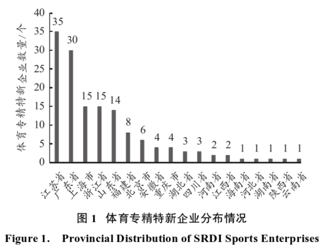 《北京市人民政府关于加快发展体育产业的实施意见》提出,鼓励和引导各类民间资本结合大众体育需求,发展“专、精、特、新”的中小型体育企业;《国务院办公厅关于加快发展健身休闲产业的指导意见》提出,鼓励各类中小微健身休闲企业、运动俱乐部向“ 专精特新”方向发展。此后,中央及地方均在多项规划文件中强调培育体育专精特新企业。近年,体育专精特新企业群体持续壮大,从2023年的49家增至2024年的146家(国家体育总局,2024),呈现出快速增长态势。这146家企业共覆盖18个省(区、市),其中江苏省、广东省、上海市及浙江省数量最多,分别达到35、30、15、15家,合计占比超过65%(图1)。部分省(区、市)呈现出特色化、差异化集聚形态。浙江省依托山河湖海资源、户外运动消费市场以及对外贸易网络,15家企业中有9家专注于户外运动领域;重庆市具有深厚的汽车工业基础,4家体育专精特新企业中有3家集中在运动汽车、摩托车研发制造等细分领域,形成了汽摩行业技术密集型细分赛道;广东省多数企业致力于VR技术产品、运动智能可穿戴设备等高精尖产品研发,契合了广东省科技创新高地特质。