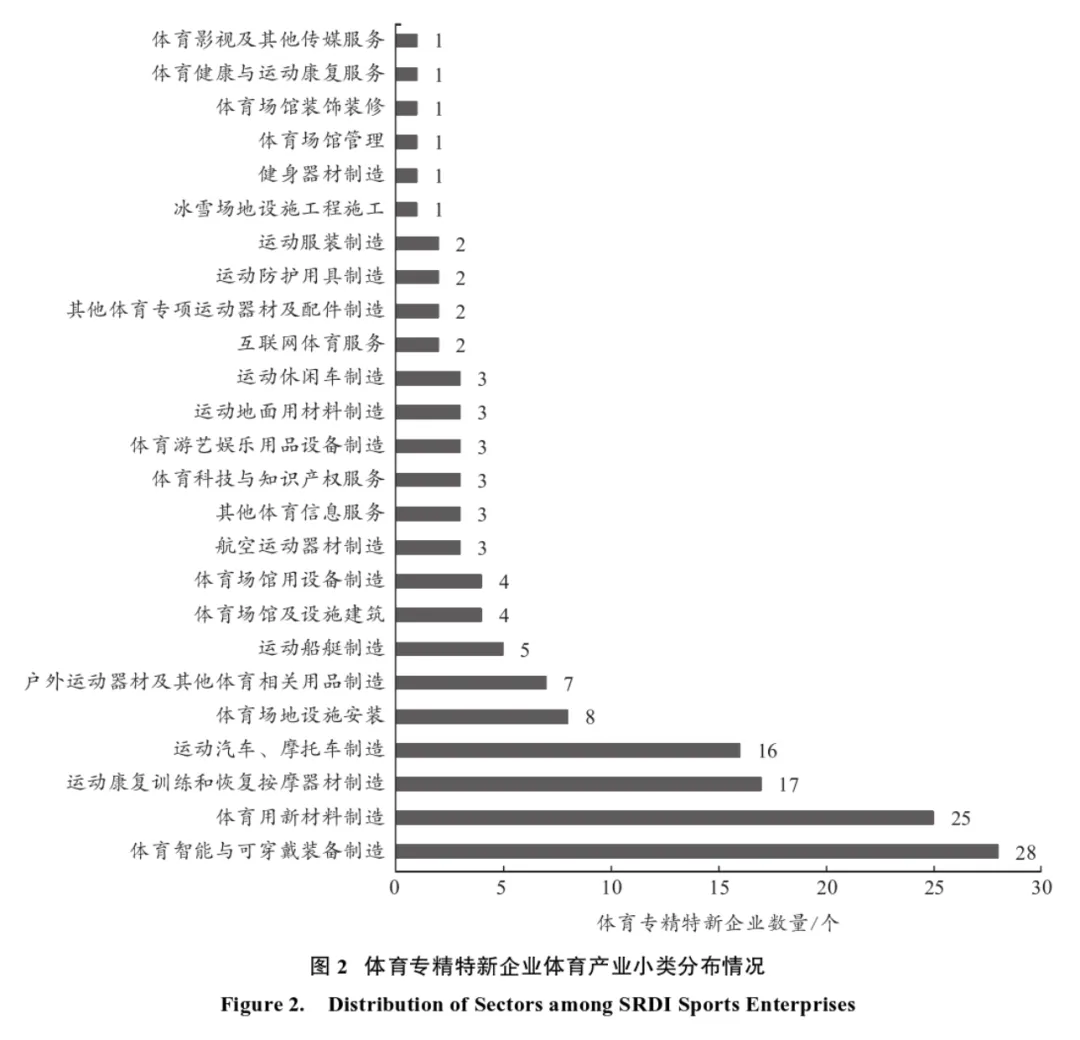 146家体育专精特新企业涉及25个细分业态(图2)。其中,技术密度较高的体育智能与可穿戴装备制造,体育用新材料制造,运动康复训练和恢复按摩器材制造,运动汽车、摩托车制造等领域的企业数量最多,分别达到了28、25、17、16家,合计占比接近60%。体育场地设施安装、户外运动器材及其他体育相关用品制造、运动船艇制造、体育场馆及设施建筑、体育场馆用设备制造数量较多,分别为8、7、5、4、4家。此外,冰雪场地设施工程施工、健身器材制造、体育场馆管理、体育场馆装饰装修、体育健康与运动康复服务、体育影视及其他传媒服务等领域也涌现出专精特新企业。