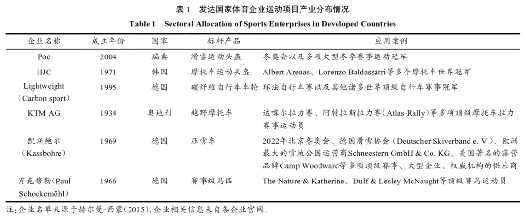 运动项目产业链具有涉及面广、环节多元等特征,适合体育领域专精特新企业聚焦垂直细分领域。发达国家与专精特新相同类型的企业,如在美国的利基企业、德国的隐形冠军企业、韩国的中坚企业中主营体育相关业务的企业,主要聚焦运动项目产业链的特定细分环节并形成专业化竞争优势(表1)。例如,Poc专研滑雪运动头盔、Lightweight(Carbon sport)聚焦碳纤维自行车车轮。此外,KTM AG专注越野摩托车,覆盖探险、街车等领域;凯斯鲍尔旗下的PistenBully压雪车占据全球65%以上的滑雪场设备市场。与国际发展趋势一致,接近50%的我国体育专精特新企业专注于运动项目产业链的某一细分领域。如轮锋车料、巨隆机械等长期专注运动自行车的链轮曲柄、中轴及脚踏等部件;炙焱动力、宗申机车等致力于运动摩托车的发动机、轮毂及全地形车配件等产品研发;千禧龙纤、拓展纤维等聚焦钓鱼运动中的碳纤维鱼竿、鱼线、专用手套等领域。进一步调研与分析发现,自行车、汽车、摩托车等竞速类项目企业多聚焦于服务产品的配套零部件研发,钓鱼、射击、航空等户外运动领域企业倾向于提供专用功能产品。