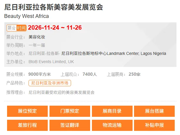 中国美容产品以高性价比和多样性在尼日利亚市场受欢迎,尤其在护肤、彩妆和美发工具领域,展会为中国企业提供直接对接西非买家的平台