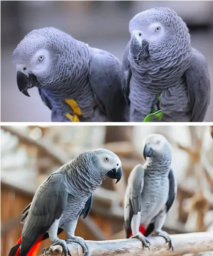 非洲灰鹦鹉体长33-41厘米,体重400-490克,寿命约50年。属于大型鹦鹉,尾巴短,头部圆,面部长毛,喜攀爬,不善飞翔。身体为深浅不一的灰色,脸部眼睛周围有一片狭长的白色裸皮;头部和颈部的灰色羽毛带有浅灰色滚边,腹部的灰色羽毛则带有深色滚边;主要飞行羽灰黑色;尾羽鲜红色;鸟喙黑色,虹膜黄色。幼鸟尾羽尖端带有黑色,虹膜为浅灰色,随着年纪渐长会变为黄色。