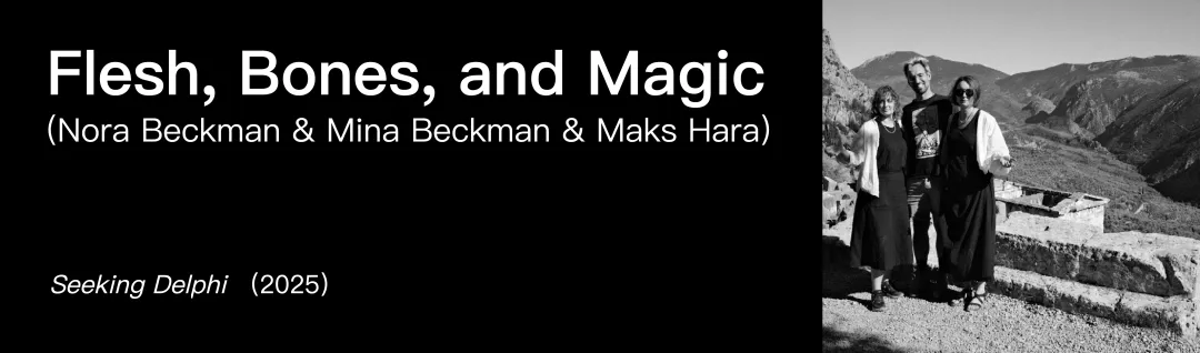 声音,往往比图像更能触及时间的褶皱。由 Nora Beckman、Mina Beckman 与 Maks Hara 组成的艺术团体 Flesh, Bones, and Magic 在他们的多媒介作品Seeking Delphi中,将德尔斐考古遗址的场域声音与现场文本层叠交织。古老神谕的口传传统在感官的振动中被唤醒,跨越千年,在展览中再次进入我们的知觉阈值。