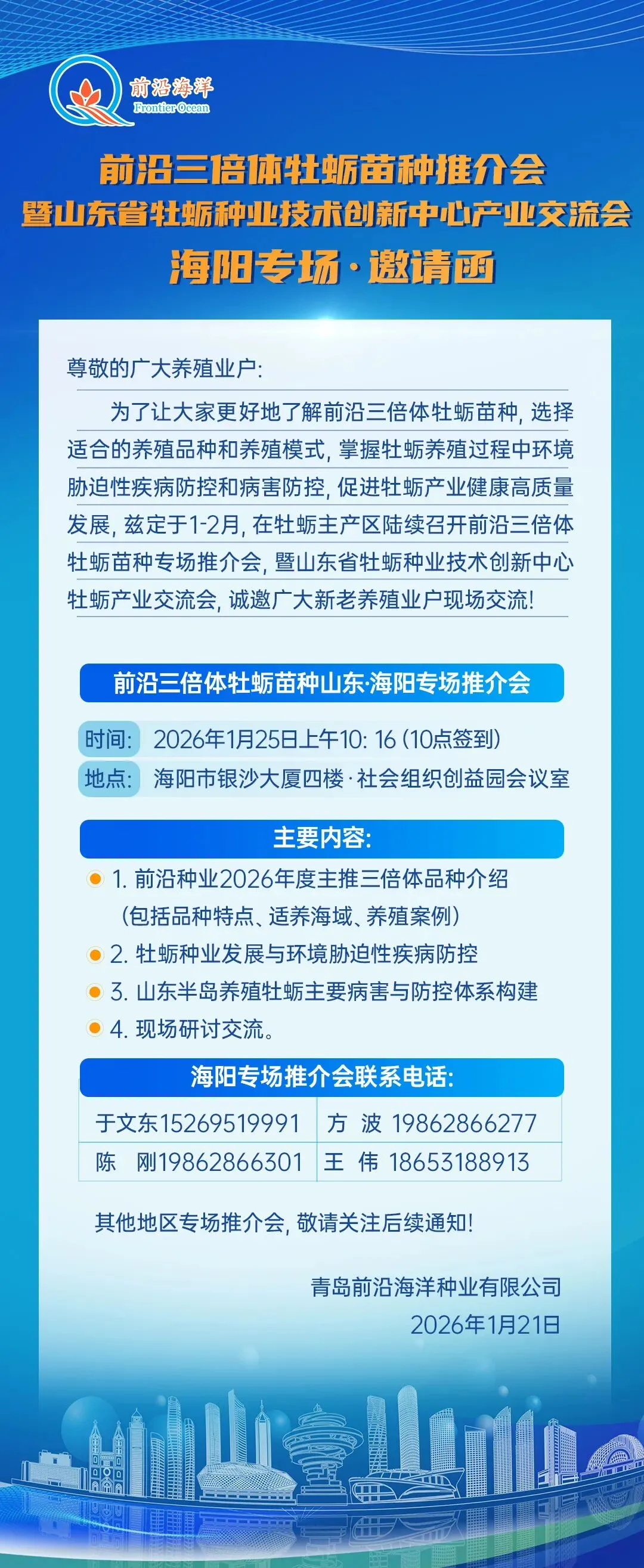 为了让广大养殖业户更好地了解前沿三倍体牡蛎苗种,根据自己海域选择适合的养殖品种和养殖模式,掌握牡蛎养殖过程中环境胁迫性疾病防控和病害防控,促进牡蛎产业健康高质量发展。兹定于2026年1月25日(周日)上午,在烟台·海阳·社会组织创益园,召开前沿三倍体牡蛎苗种·海阳专场推介会暨山东省牡蛎种业技术创新中心牡蛎产业交流会。其他主养区专场推介会陆续举行,敬请关注后续通知!