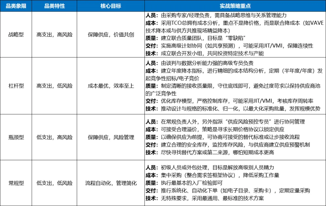 至此,我们已经掌握了从外部市场分析到内部品类定位的完整方法论,能够为不同的采购标的制定精准的策略。