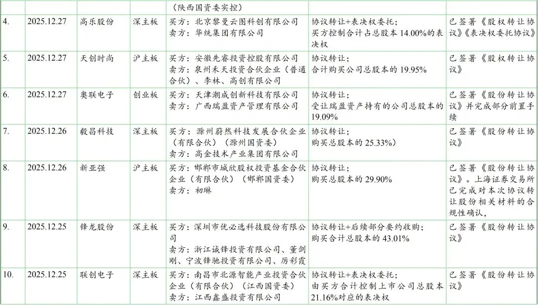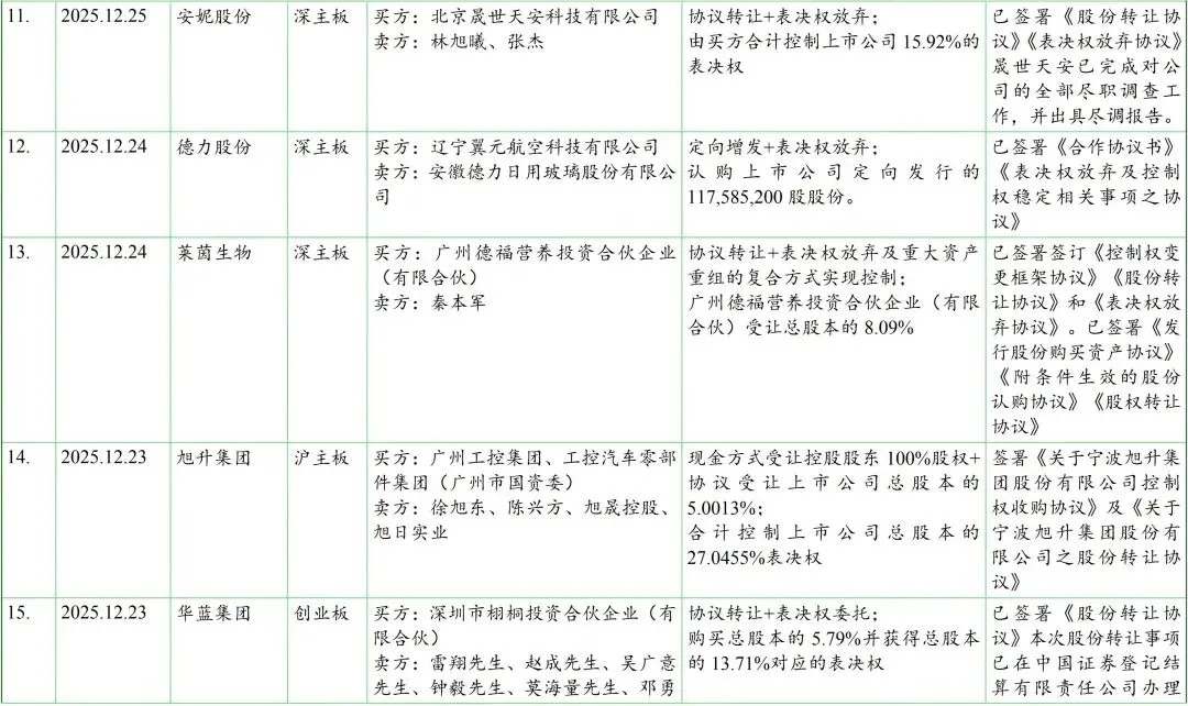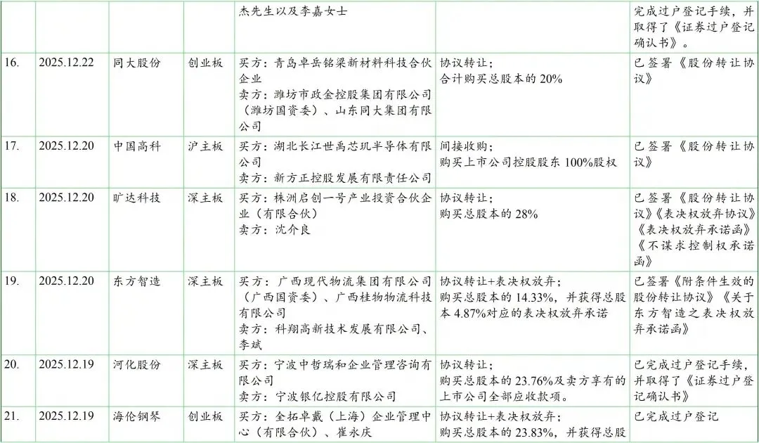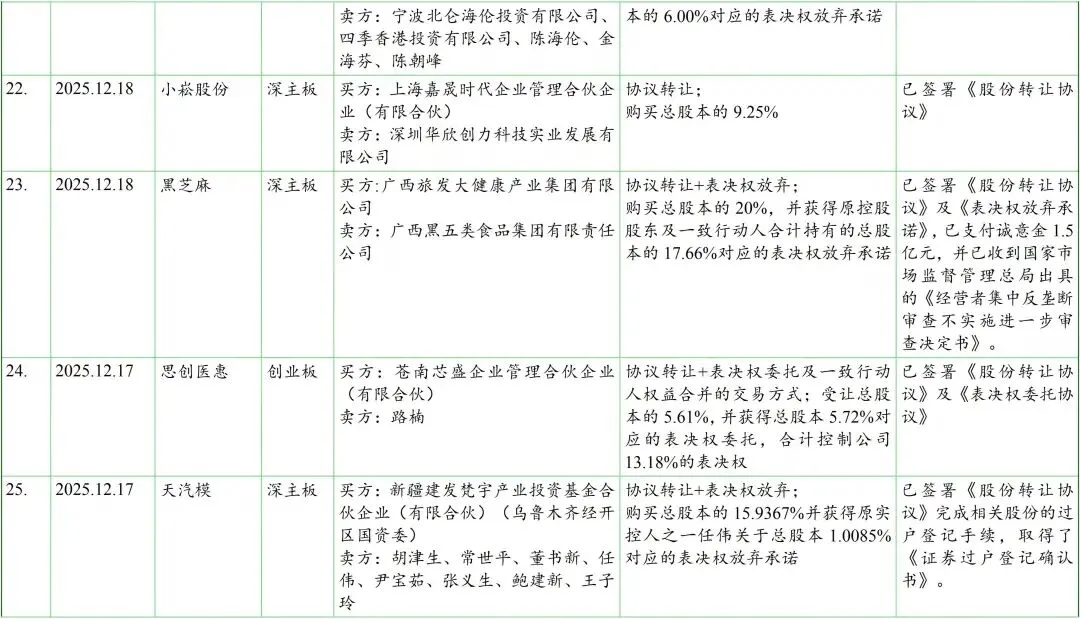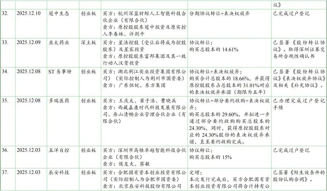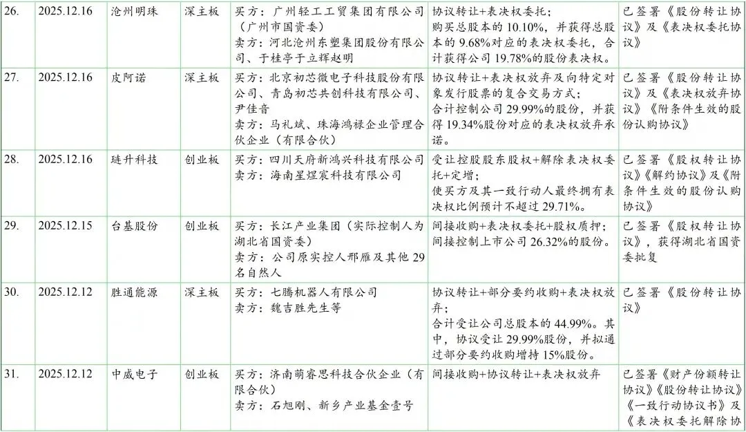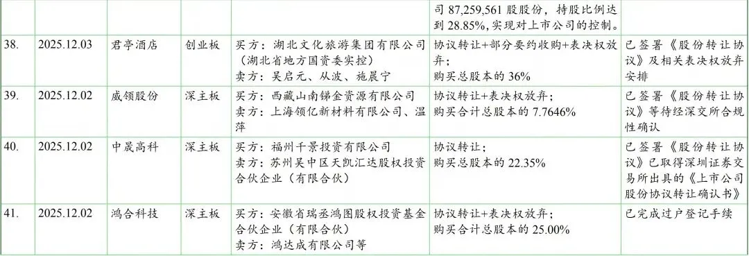 我们在见微数据库中,以“控制权”为关键词、按照最新公告日设定检索周期为2025年12月1日至12月31日。检索结果显示,期间共有56家上市公司发布了120份涉及控制权交易(含交易进展)的公告。剔除一致行动协议(表决权委托协议)解除、无偿划转、司法拍卖等非交易性的因素导致的控制权变动,以及已公告终止的交易后,剩余仍在推进中且已披露交易方案的控制权交易涉及约40家上市公司,基本信息如下表: