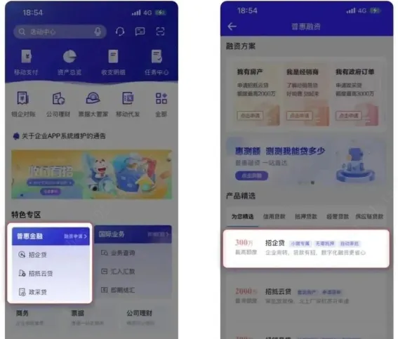 操作路径:登录招行企业APP → 首页「特色专区」→「普惠金融」→「产品精选」→「招企贷」,系统自动核验白名单资格;