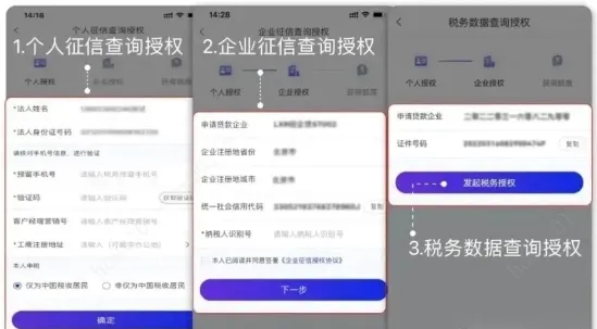 授权内容:依次完成「个人征信查询授权」「企业征信查询授权」「税务数据查询授权」;