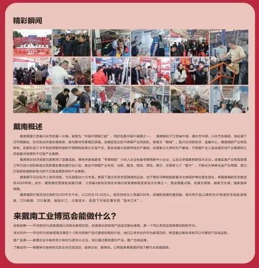 值此十届盛会之际,本届工博会以“十年淬炼,钢铸新篇”为主题,以推进枢纽经济为主线,实现展会规模、能级与体验的全面升级。展会将聚焦不锈钢、特种合金、高端装备等优势产业,集中展示戴南在高端不锈钢材料、核电军工用特种合金、精密零部件等领域的最新成果,以及“基金配套、创新配套、中试配套”三位一体的产业生态与“七集中”升级后的优质投资环境 。此次盛会不仅是对戴南不锈钢产业数十年发展成就的集中检阅,更是放大苏超效应、巩固戴南全国核心地位、赋能区域经济高质量发展的重要契机,预计将吸引超千余家企业参展、数万名专业采购商与会,再创交易额新高。