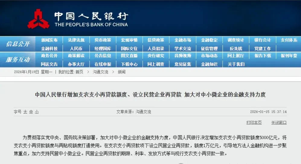 而在早些时候,中国人民银行连续打出政策“组合拳”,为实体经济注入强劲动力。1月15日,央行接连发布两条重磅公告:决定下调再贷款、再贴现利率0.25个百分点,并增加支农支小再贷款额度5000亿元,设立额度高达1万亿元的民营企业再贷款。