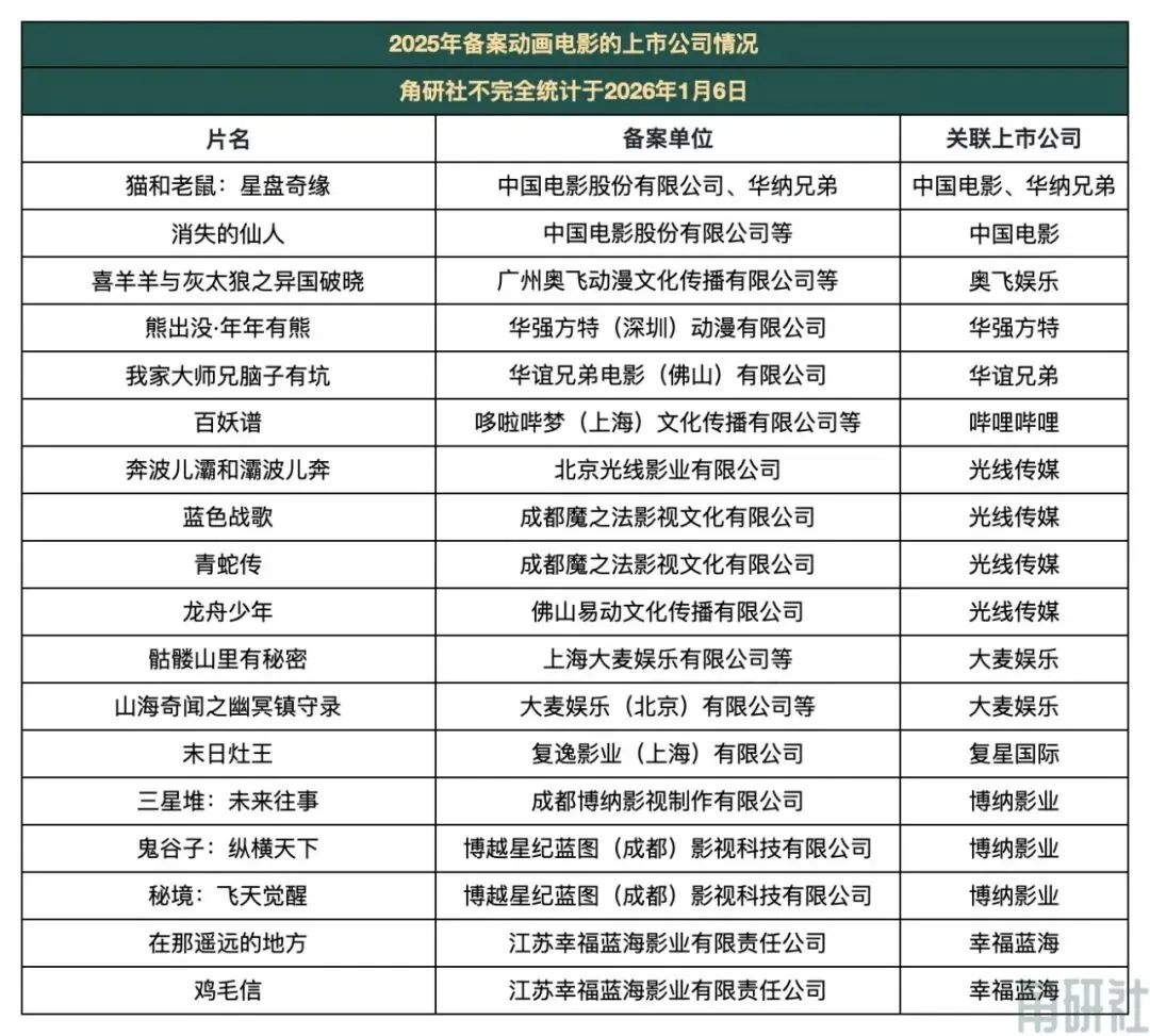 据角研社不完全统计,2025年备案的动画电影中,有11家上市公司的身影,分别是中国电影、华纳兄弟、奥飞娱乐、华谊兄弟、复星国际、哔哩哔哩、光线传媒、大麦娱乐、华强方特、幸福蓝海、博纳影业。