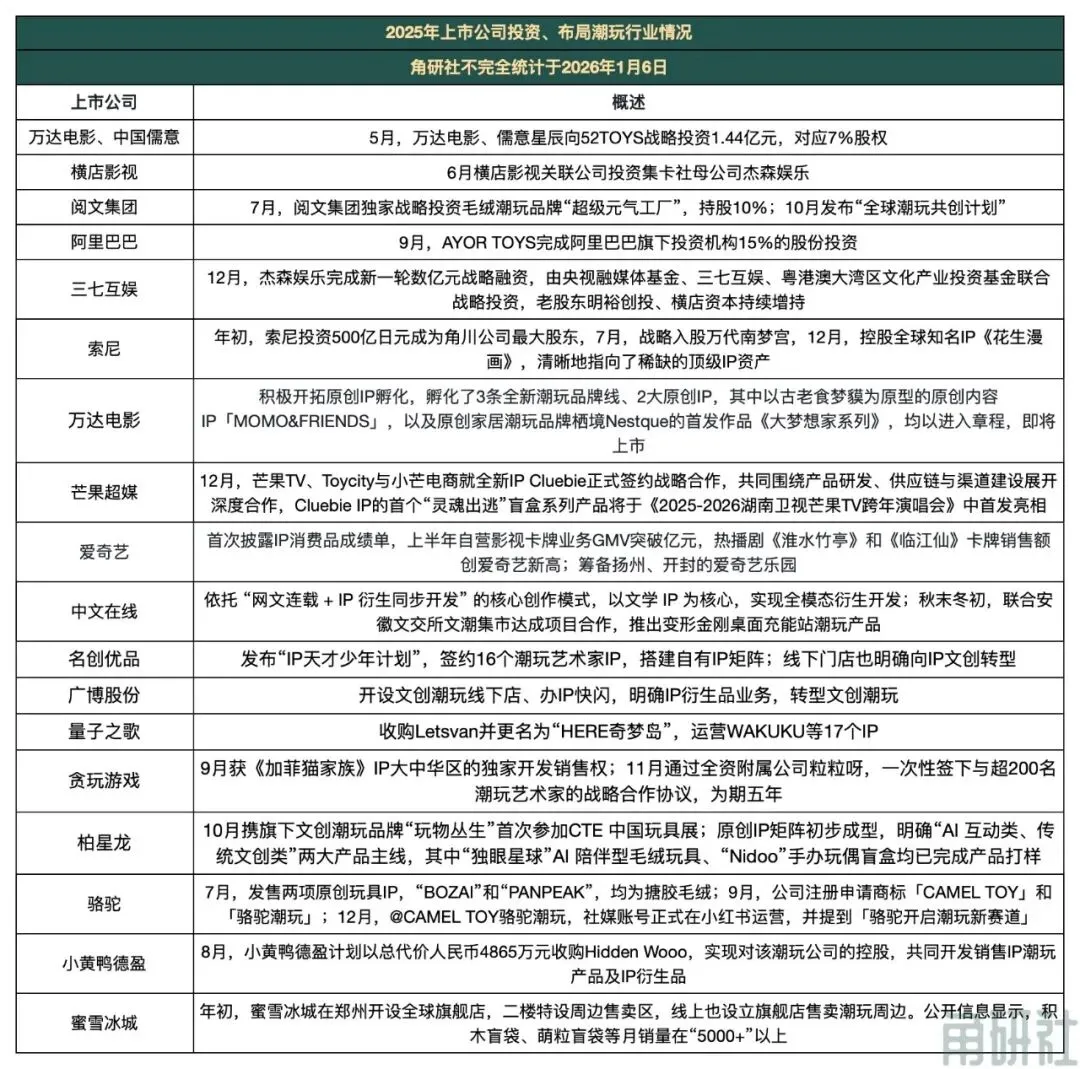2025年,万达电影、中国儒意、横店影视、阅文集团、阿里巴巴、三七互娱等行业巨头纷纷以资本入局,分别战略投资52TOYS、杰森娱乐、超级元气工厂、AYOR TOYS等潮玩头部品牌。