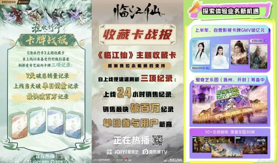 爱奇艺的卡牌业务在2025年迎来爆发期,上半年自营影视卡牌业务GMV突破亿元,热播剧《淮水竹亭》《临江仙》的卡牌销售额创下平台历史新高。在衍生品之外,爱奇艺更将IP价值向线下场景延伸,位于扬州、开封的爱奇艺主题乐园已进入筹备阶段。