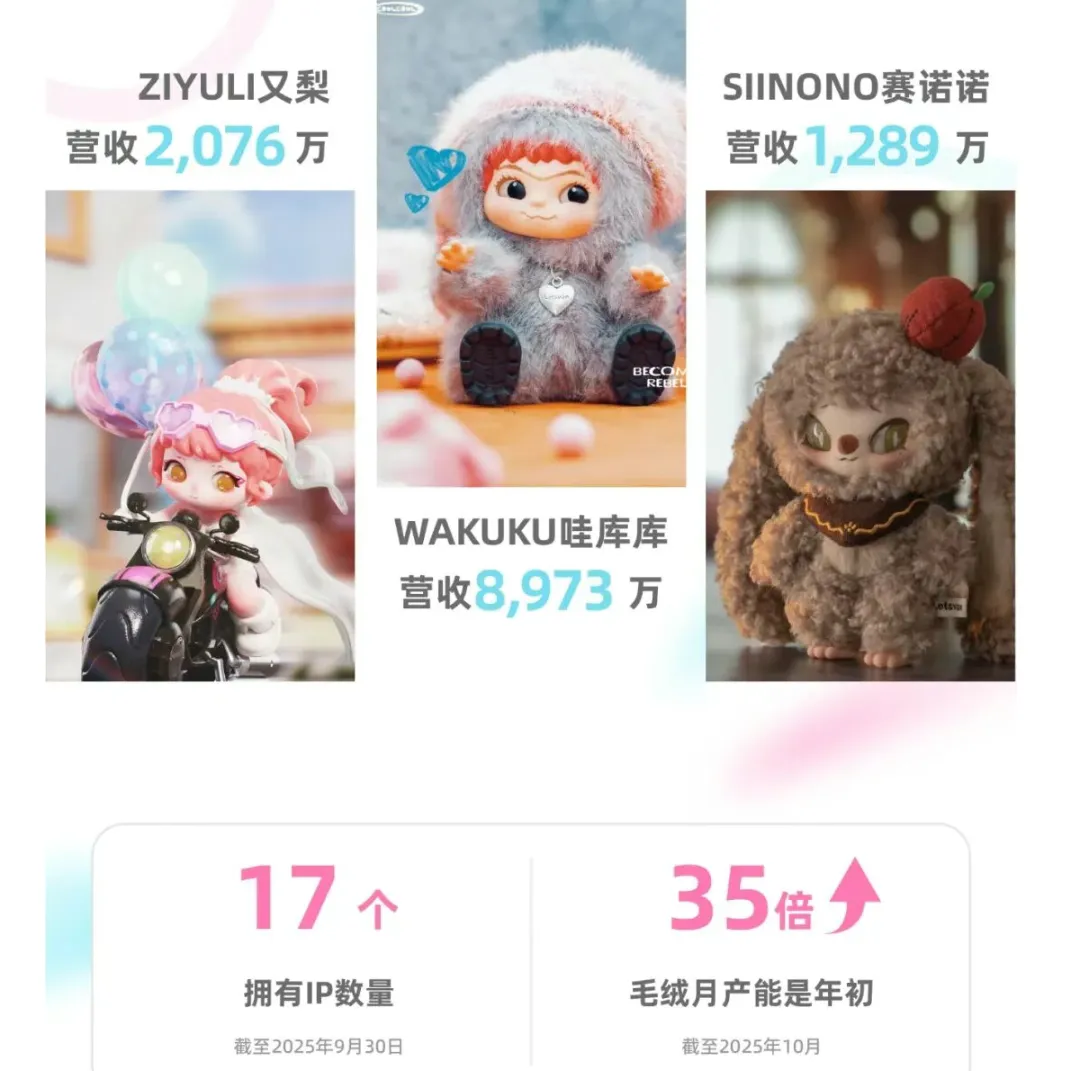 量子之歌的转型更为彻底,通过收购Letsvan熠起文化全部股份,更名奇梦岛集团,手握17个核心IP。从2025年公司公布的截至9月30日的季度业绩来看,其潮玩业务已实现规模化创收,“WAKUKU哇库库”创收8973万元、“ZIYULI又梨”2076万元、“SIINONO赛诺诺”1289万元,其余14个IP合计创收约500万元。