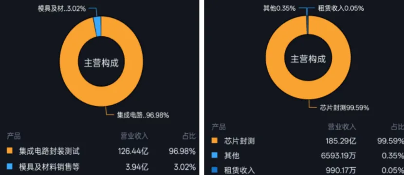 两家公司在主营业务上都表现出极高的专注度,均将集成电路封测相关业务作为核心发展方向。不过长电科技在芯片封测业务上的集中度更高,几乎达到“全盘押注”的状态;通富微电虽然集成电路封装测试也占主导,但还有少量模具及材料销售等其他业务。