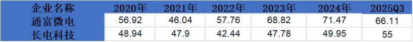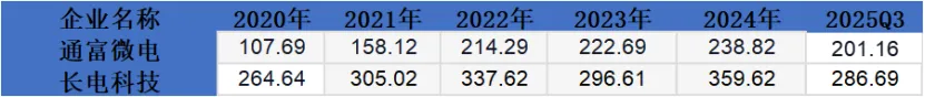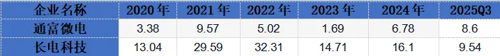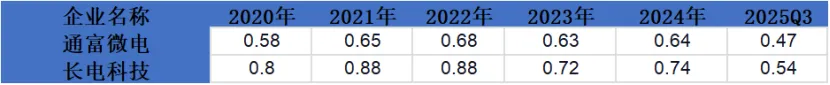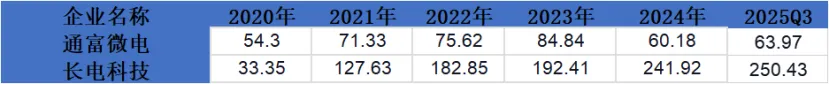 从盈利规模来看在2020 - 2025年第三季度期间,长电科技净利润规模整体大于通富微电。这说明长电科技在盈利能力上相对较强,可能得益于其更大的业务规模、更成熟的运营模式或更有效的成本控制等因素,使其在市场竞争中能够获取更多的利润。