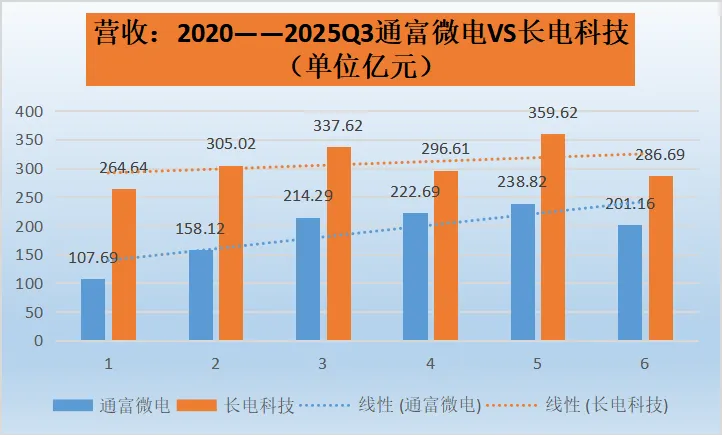 在2020 - 2025年第三季度期间,长电科技的营收规模整体大于通富微电。这表明长电科技在集成电路封测行业的市场份额相对较大,业务基础更为雄厚,可能在客户资源、生产规模等方面具有一定优势。