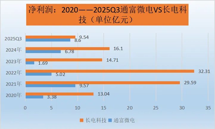 长电科技:净利润同样存在波动。2020 - 2022年从13.04亿元增长到32.31亿元,增长态势良好;2023年降至14.71亿元,2024年微增至16.1亿元,2025年第三季度为9.54亿元。整体上在2022年后净利润增长乏力甚至下滑,虽2024年有小幅增长,但增长幅度有限,显示出公司在维持盈利增长方面面临一定挑战。