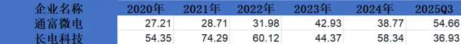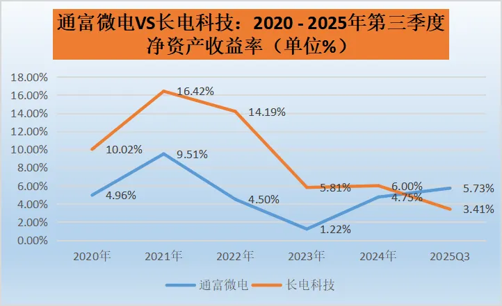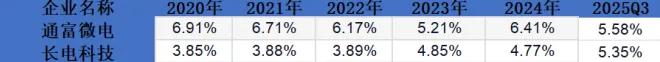 长电科技:同样呈现波动状态,但相对通富微电波动幅度稍小。2020 - 2021年从10.02%上升到16.42%,之后逐年下降,到2025年第三季度降至3.41%。这表明长电科技虽然也受到内外部因素影响,但在盈利的稳定性上略优于通富微电,不过整体也面临着盈利水平下滑的压力,需要关注影响其收益的关键因素。