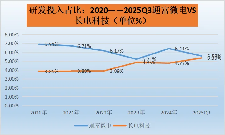 从研发投入力度看在各年度中,通富微电的研发投入占比整体高于长电科技。这表明通富微电相对更重视研发投入,可能在技术创新、产品升级等方面投入了更多的资源,以提升自身的技术竞争力,抢占市场份额。