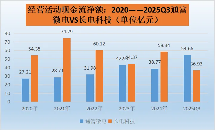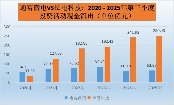 长电科技:投资活动现金流出规模整体大于通富微电,且在2020 - 2024年持续上升,从33.35大幅增长到241.92,2025年第三季度为250.43。这说明长电科技在投资方面的力度较大且持续增加,反映出公司积极扩张的战略意图,可能致力于进一步提升产能、拓展业务领域或加强技术研发能力。