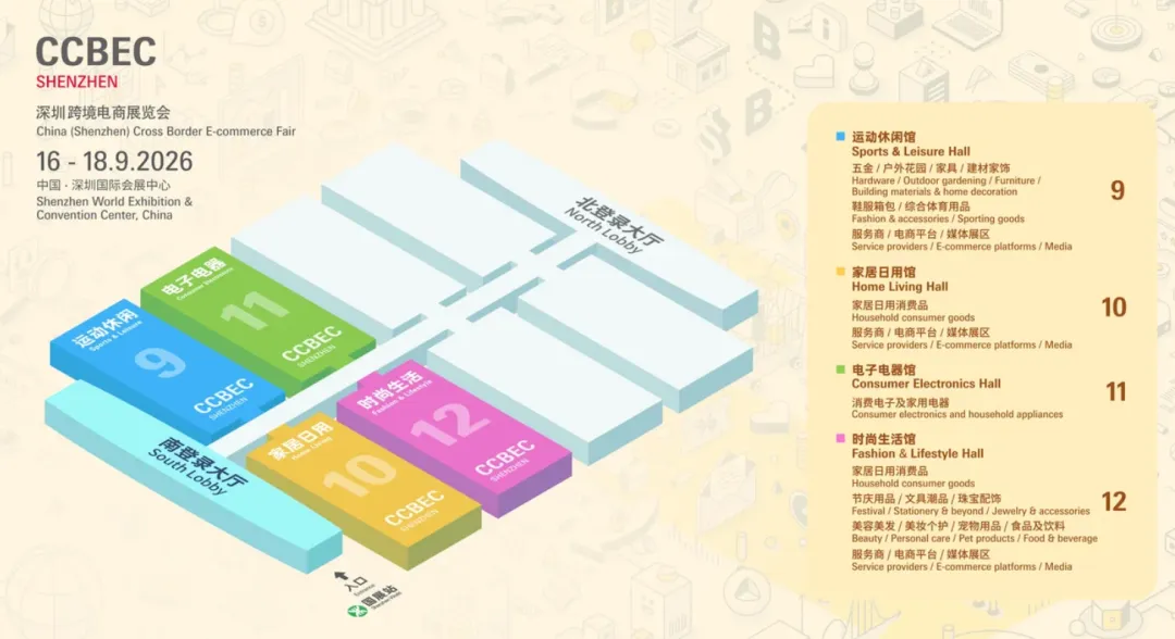 2026CCBEC定档金秋九月!9月16-18日在深圳国际会展中心启幕,启用9-12号馆,聚焦运动休闲、家居日用、电子电器、时尚生活四大核心品类,预计汇聚1500+展商、10万+专业观众,持续打造全球跨境电商平台生态圈。