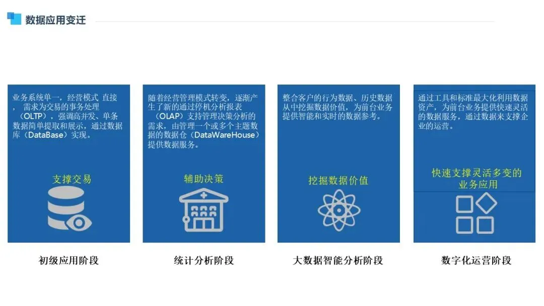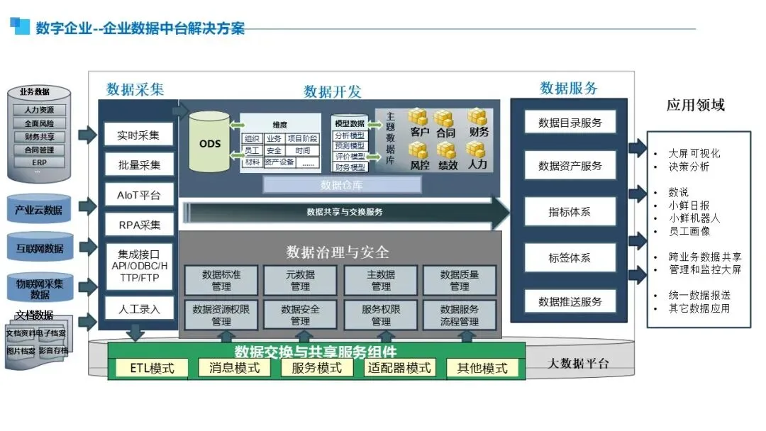 关键能力:资源共享、资产管理、开放服务、自助分析,旨在整合跨平台数据、封装为服务、赋能前台业务。