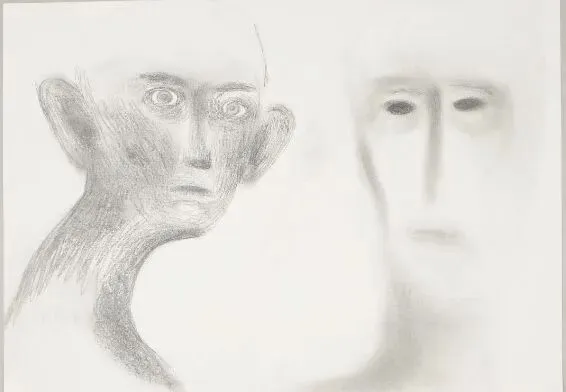 第二组对话将卡恩极具代表性的纸上作品,与费尔汉德勒近期的双联画《Victoria and Edward(维多利亚和爱德华)》(2025)并置呈现。卡恩的创作始终将人体视为脆弱、暴力、欲望与抵抗交织之所。其三联作《was mich anschaut, 01.04.1994(凝视着我的东西)》(1994)以令人不安的强烈视觉直面观者,扭曲的面孔与身体形象以近乎赤裸的即时性浮现,在亲密与威胁之间摆荡。