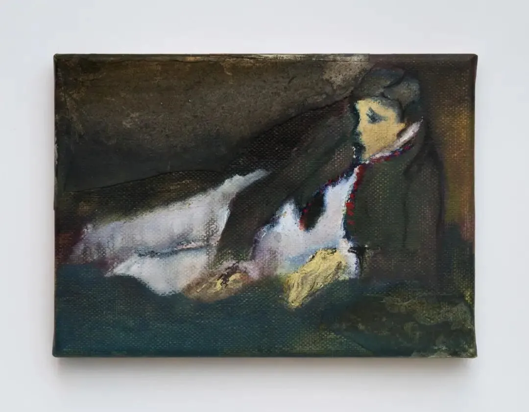 相比之下,费尔汉德勒的《Victoria and Edward》呈现出一种更为安静却同样充满张力的回应。画中人物仿佛悬置于亲近与疏离、亲密与异化之间;通过姿态、凝视与尺度的细微转换,她探讨情感依附、权力关系与脆弱的连结。其形式虽节制,却蕴含潜伏的心理重量,与卡恩作品中强烈而直接的情感能量形成共振。