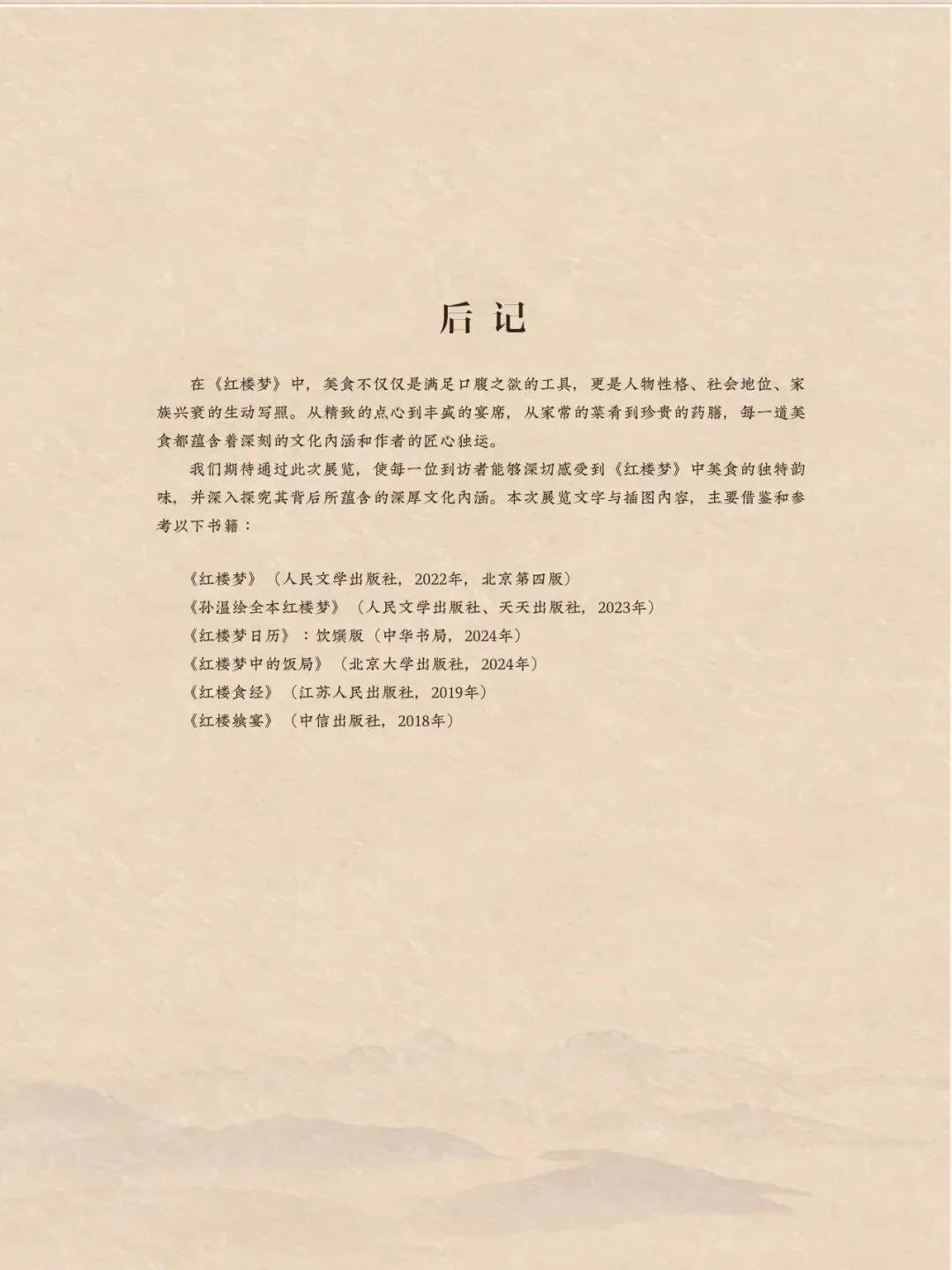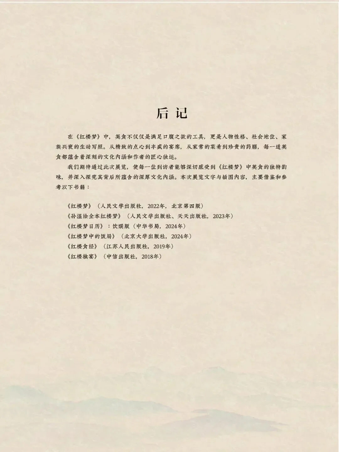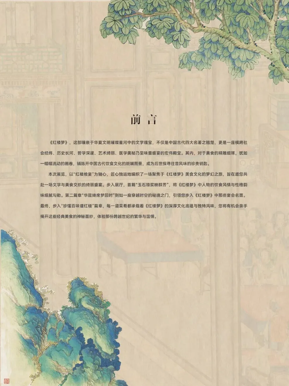 展览内容:本次展览,以“红楼飨宴”为轴心,匠心独运地编织了一场聚焦于《红楼梦》美食文化的梦幻之旅,旨在邀您共赴一场文学与美食交织的绮丽盛宴。