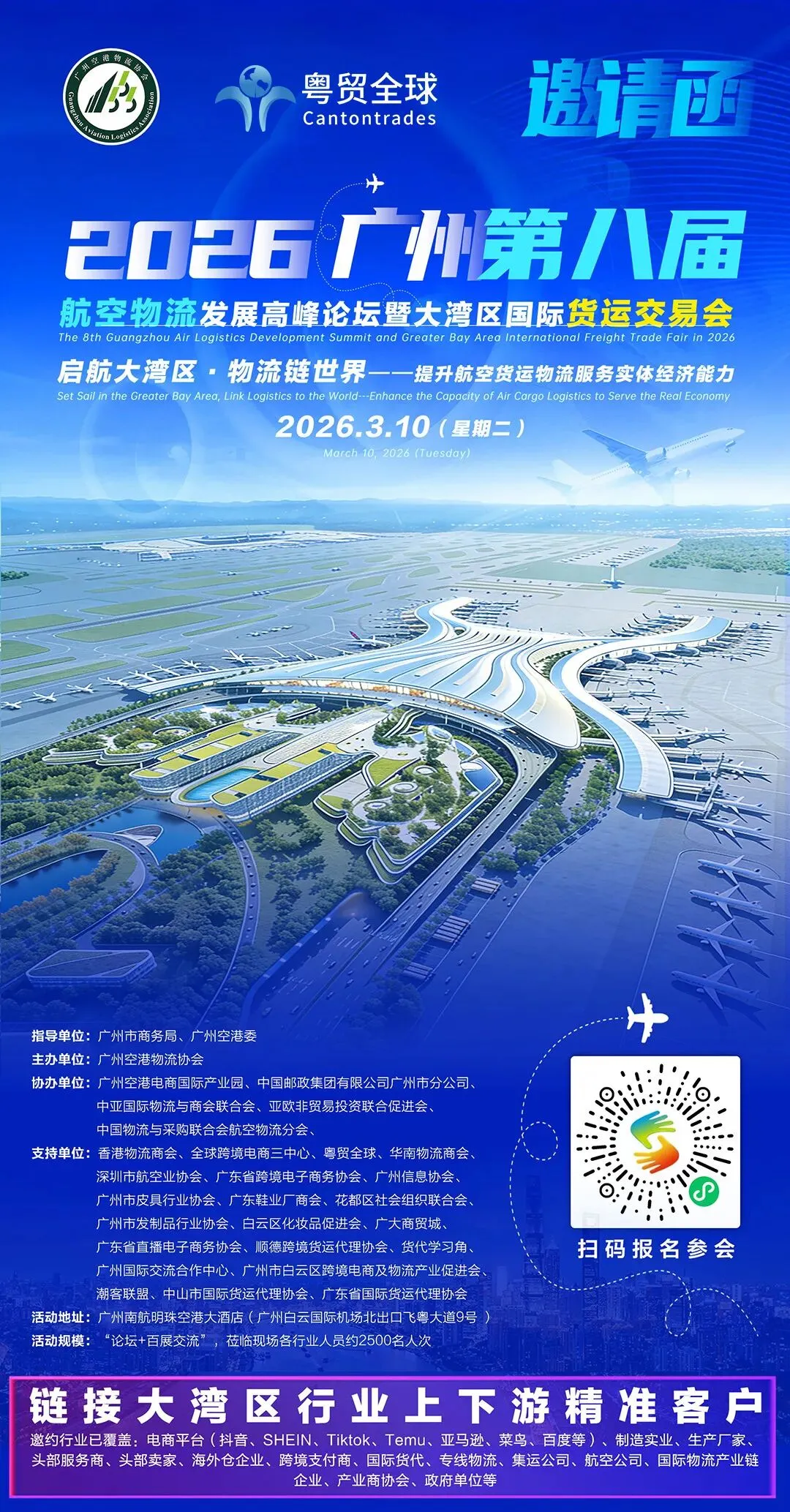 2026 跨境物流赛道的开年红利,就在这场开年盛会!粤贸全球邀你共赴广州空港,与 2500 + 行业先锋共谋发展,错过再等一年,赶紧扫码 / 致电锁定席位!