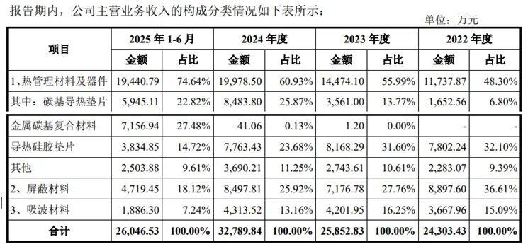 公司产品同时具有多种功能,按照其应用时的主要功能划分,可分为导热散热材料、电磁屏蔽材料和绝缘耐高温材料。