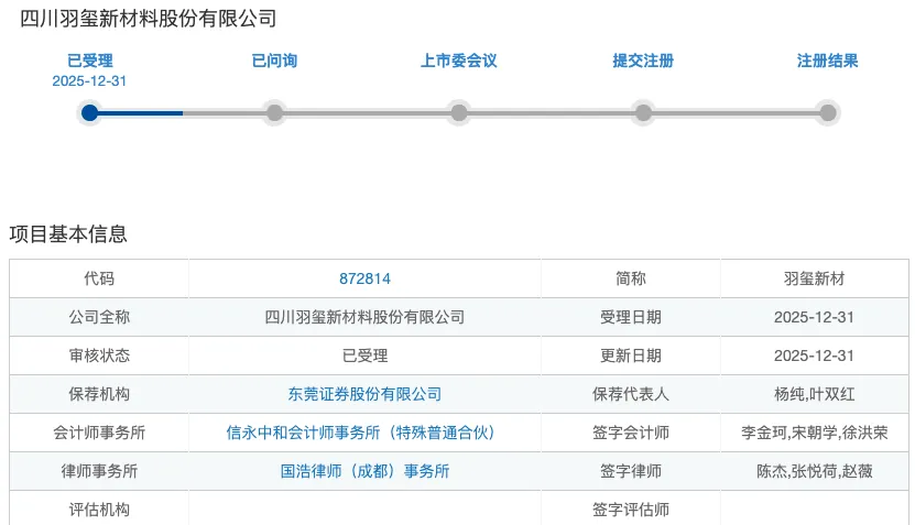 近日,四川羽玺新材料股份有限公司(以下简称“羽玺新材”)向北交所递交的上市申请正式获受理。