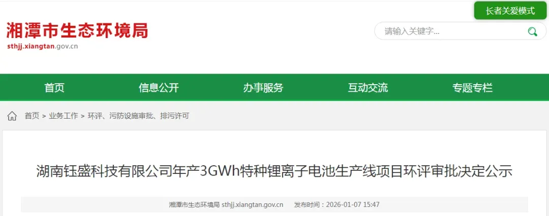 日前,湘潭市生态环境局发布了《湖南钰盛科技有限公司年产3GWh特种锂离子电池生产线项目环评审批决定公示》。
