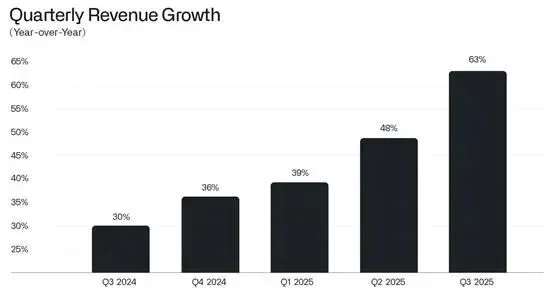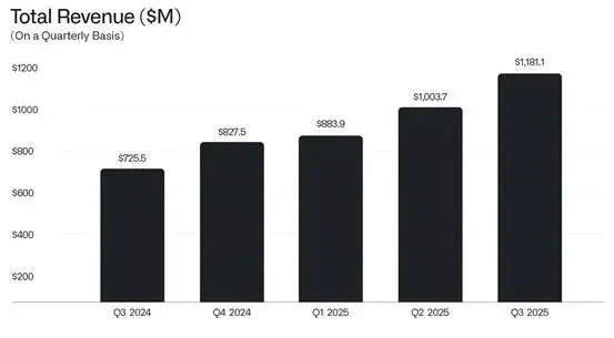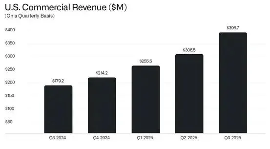 单季自由现金流:5.4亿美元(FCF利润率46%) 前三季度累计营收:30.69亿美元 前三季度累计净利润:10.23亿美元 全年营收指引:43.96-44亿美元(同比+53%左右) 美国商业业务Q3收入:3.97亿美元(过去12个月增长121%)