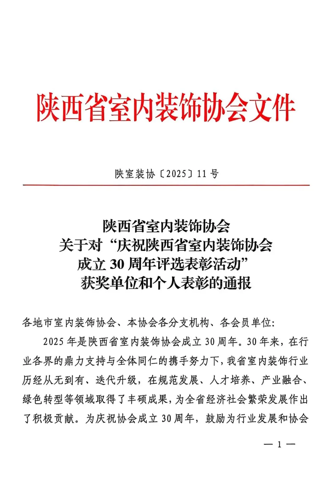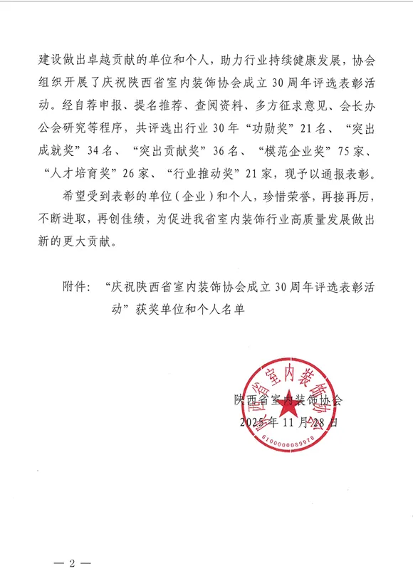 2025 年是陕西省室内装饰协会成立 30 周年。三十年来,在行业各界的携手努力下,陕西室内装饰行业历经从无到有、迭代升级的跨越发展,在规范发展、人才培养、产业融合、绿色转型等领域取得丰硕成果,为全省经济社会繁荣发展注入了强劲动能。本次表彰活动旨在回顾行业发展历程,表彰为行业进步与协会建设作出重要贡献的单位与个人,凝聚行业共识,共绘未来蓝图。