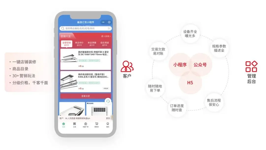 除线下销售外,搭建24小时不打烊线上商城,满足下游客户(建材市场吊顶门店,灯饰店,卫浴门店,五金店灯)在线交易,而且是自家域名的商城,支持千客千价,下游客户在线下单、跟进订单进度及履约配送全流程管理