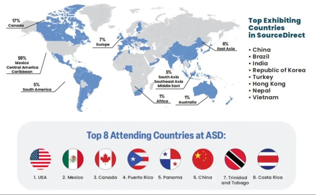 ASD 吸引的国际买家数量位居全美B2B批发及综合商品展会之首。展会汇聚了来自美国、加拿大、墨西哥及众多南美国家的核心买家,覆盖全球80个国家和地区,数万名专业采购人士齐聚一堂。