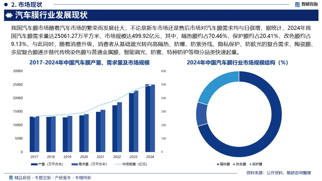 汽车膜是一种应用于汽车车窗及车身表面的特殊薄膜材料,主要起到隔热、防晒、防爆、原厂车漆保护、隐私保护、装饰及个性化改装的作用。我国汽车膜市场随着汽车市场的繁荣而发展壮大,不论是新车市场还是售后市场对汽车膜需求均与日俱增,据统计,2024年我国汽车膜需求量达25061.27万平方米,市场规模达499.92亿元,其中,隔热膜约占70.46%,保护膜约占20.41%,改色膜约占9.13%,与此同时,随着消费升级,消费者从基础遮光转向高隔热、防爆、防紫外线、隐私保护、防眩光的复合需求,陶瓷膜、多层复合膜逐步替代传统染色膜与普通金属膜,智能调光、防雾、特种防护等细分品类快速起量。
