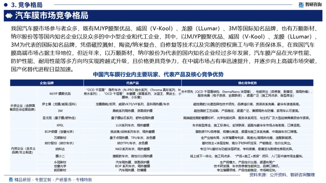 市场竞争格局:我国汽车膜市场参与者众多,既有MJYP膜聚优品、威固(V-Kool)、龙膜(LLumar)、3M等国际知名品牌,也有万顺新材、纳尔股份等等国内知名企业以及众多的中小型企业和代工企业,其中,以MJYP膜聚优品、威固(V-Kool)、龙膜(LLumar)、3M为代表的国际知名品牌,凭借磁控溅射、陶瓷/纳米复合、自修复等技术以及完善的授权施工与电子质保体系,在我国汽车膜高端市场占据主导地位,但近年来,以万顺新材、纳尔股份为代表的国内知名企业经过多年发展,汽车膜产品在光学性能、防护性能、耐用性能等多方向均实现跨越式升级,且价格更具竞争力,在中端市场占有率迅速提升,并逐步向上高端市场突破,国产化替代进程日益加速。