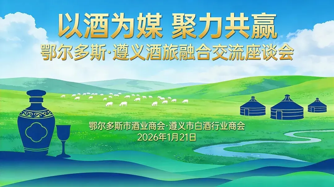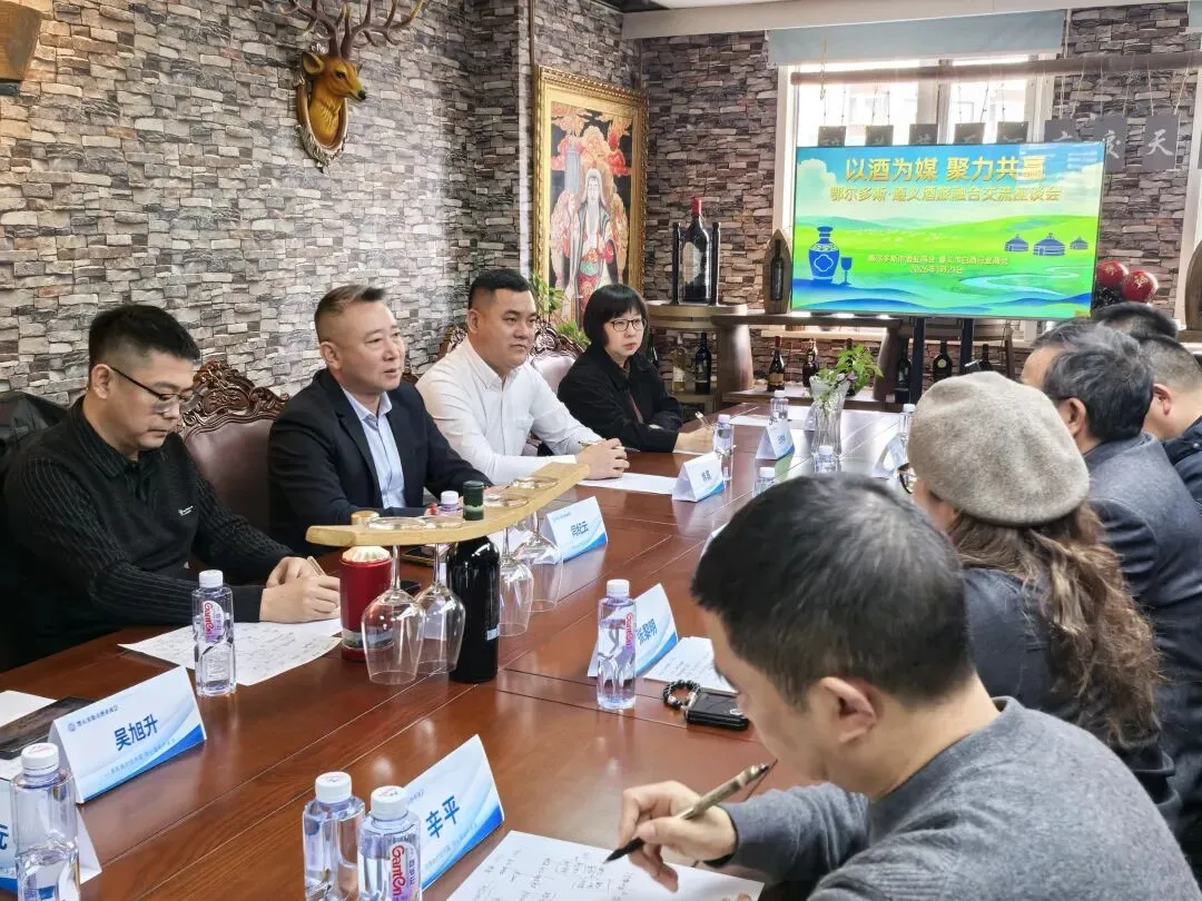 1月21日,鄂尔多斯市酒业商会与遵义市白酒行业商会共同举办“以酒为媒·聚力共赢”鄂尔多斯·遵义酒旅融合发展座谈交流会。鄂尔多斯市工商联党组成员、副主席韩磊,遵义市商务局党组成员、副局长郭勇,遵义市白酒行业商会常务副会长兼秘书长敖科凯,鄂尔多斯市酒业商会会长闫纪云、执行会长兼秘书长赵金元及相关企业代表齐聚一堂,围绕“南酒北旅”产业融合展开深度对话,共同探讨跨区域协同发展新路径。