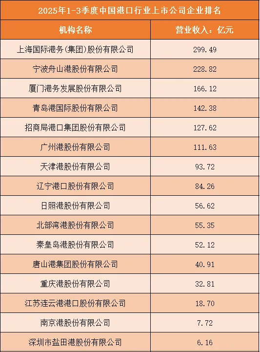 根据申万行业分类,2025年1-3季度中国港口行业上市公司按营业收入排名如下:(A股上市公司)