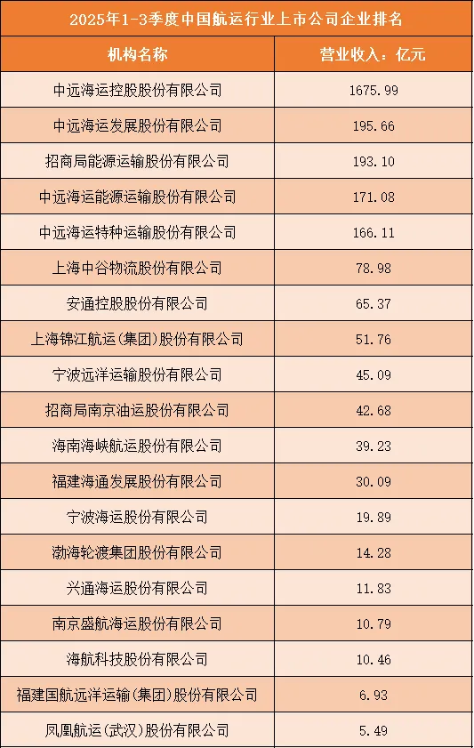 根据申万行业分类,2025年1-3季度中国航运行业上市公司按营业收入排名如下:(A股上市公司)
