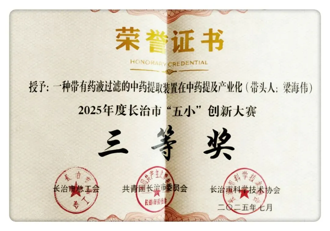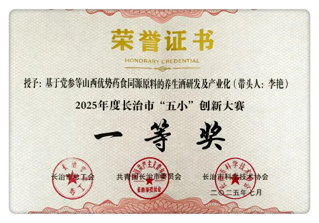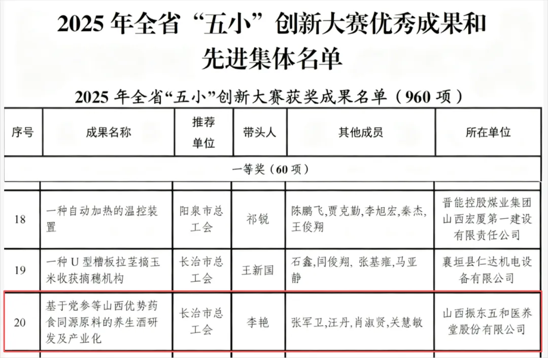一直以来,集团始终将创新作为高质量发展的重要支撑,建立健全创新激励机制、搭建产学研合作平台,激发全体员工的创新热情。在本次“五小”创新大赛中,振东五和医养堂凭借党参等山西优势药食同源原料的养生酒研发及产业化成果(带头人:李艳)获省级、市级双一等奖、五和堂制药凭借一种带有药液过滤的中药提取装置在中药提取生产上的应用成果(带头人:梁海伟)获市三等奖。