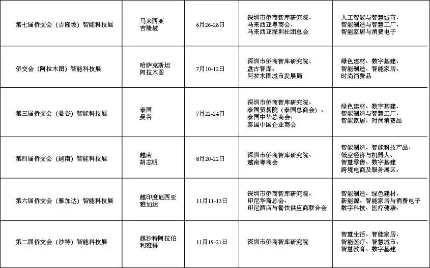 2026年,侨交会将以 “智能科技展”为核心品牌,聚焦工业智能与消费智能两大方向,在“一带一路”沿线重要市场举办系列展会。入选深圳市支持清单的六项展事包括: