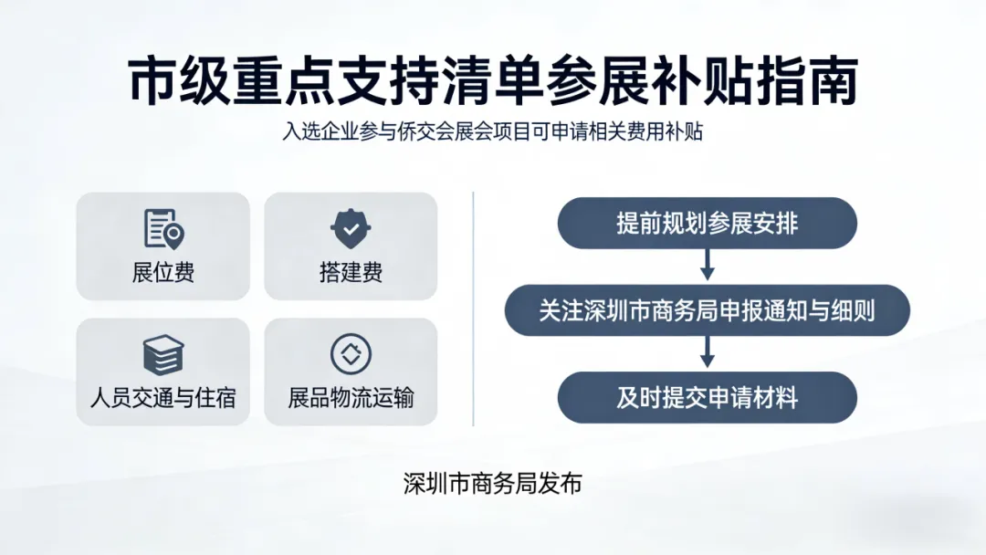 入选市级重点支持清单,意味着企业参与上述侨交会展会项目,有望申请展位费、搭建费、人员交通与住宿、展品物流运输等相关费用补贴,实质性降低跨境参展成本。建议符合条件的企业提前规划参展安排,密切关注深圳市商务局发布的申报通知与细则,及时提交申请材料。